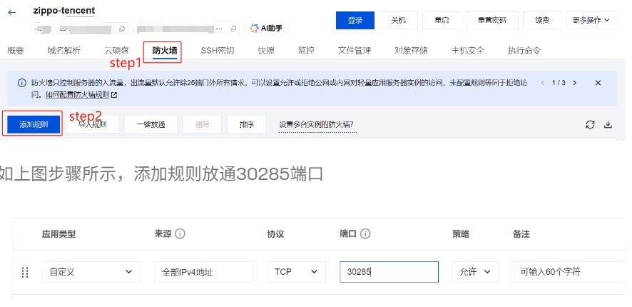 登录云服务商(这里用的腾讯云),根据登录提示信息设置云服务器安全组放行登录所需的tcp端口。